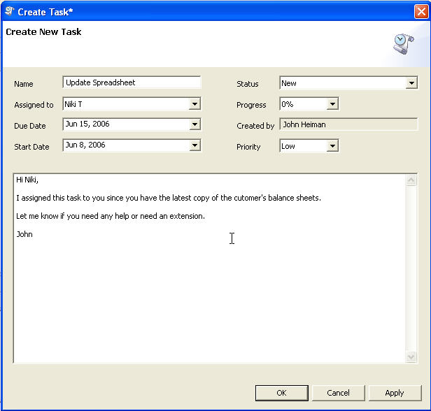 Task Objects allow you to assign yourself and any other team members a task, set the start and due dates, update progress and write in detail the actual assignment.