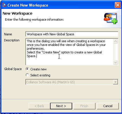 - After entering the Name and Description of your workspace you have two options to select from for the Global Space: "Create New" or "Select existing".